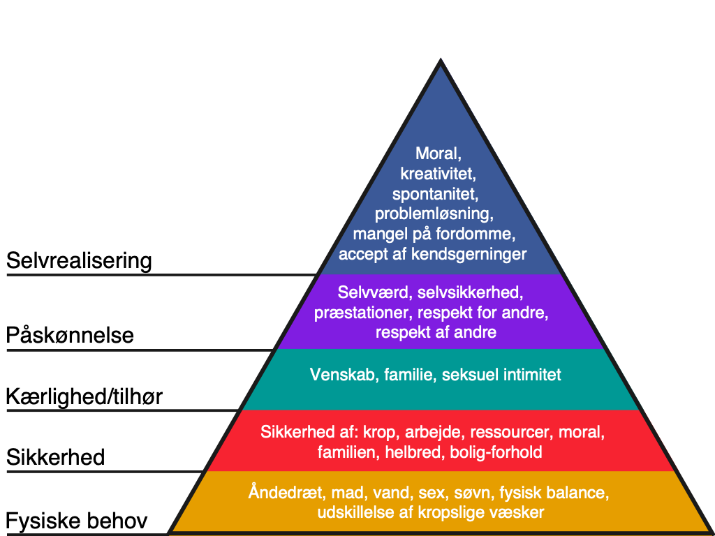 I kender nok modellen, men den er værd at dvæle ved, når man skal beskrive mennesker. Vores behov opstår ifølge teorien ikke på én gang, men følger på hinanden. Således har vi et behov for mad, før vi har et behov for sikkerhed. Har vi ikke noget mad, og er ved at sulte ihjel, er vi villige til at sætte vores sikkerhed på spil. Og har vi ingen sikkerhed, bekymrer vi os omvendt ikke meget om venskaber eller seksuel intimitet, for slet ikke at nævne moral og spontanitet.
